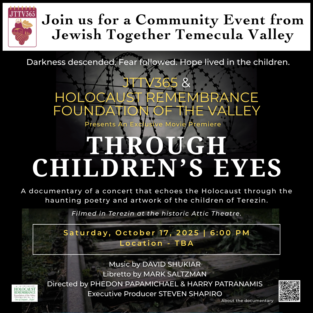 JTTV365, in partnership with the Holocaust Remembrance Foundation of the Valley, is proud to present an exclusive screening of Through Children’s Eyes—a powerful film honoring memory, resilience, and the voices of the next generation. This special event will be held at Location TBA, bringing together community members for an evening of reflection and connection. We invite you to join us in supporting this meaningful initiative and deepening our shared commitment to education and remembrance.